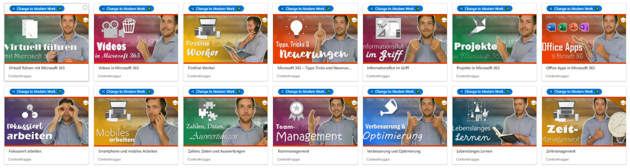 Die „Change to Modern Work“-Pakete sind Inhaltssammlungen die auf das jeweilige Unternehmen, die Anwender und die Situation angepasst werden können. Wir fokussieren den Anwendernutzen in unseren Inhalten – nicht die Funktionen einer App.